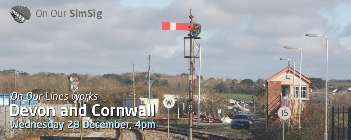Promo banner for On Our SimSig 14 - A Cornish Christmas. Base image from commons:2019 at St Erth station - signal 63.JPG - licensed CC-BY-SA 4.0.