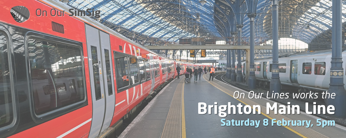 Promo banner for On Our SimSig 5 - Brighton Main Line. Base image from commons:File:Brighton station.jpg - licensed CC-BY-SA 4.0.